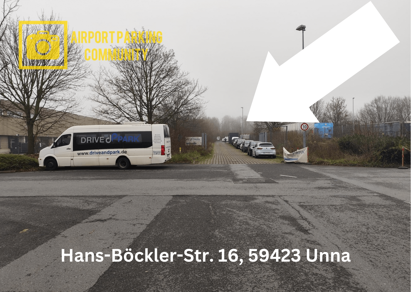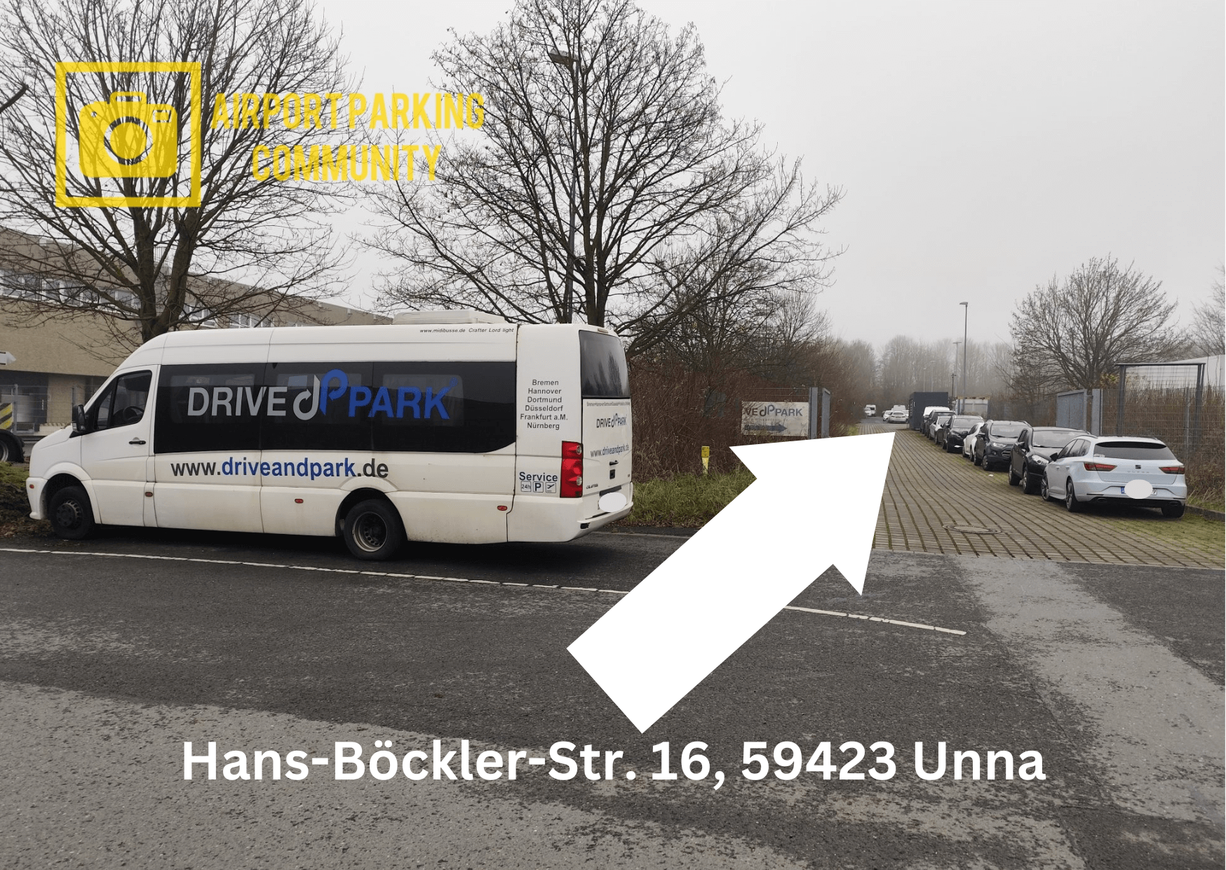 Das Parkplatzgelände von Drive & Park befindet sich in Unna/Massen, in einem Gewerbegebiet (Hans-Böckler-Strasse 16), etwa 6 Kilometer vom DTM Dortmund Flughafenterminal entfernt. Reisende werden zum Airport und zurück mit eigenem Firmenbus transportiert. Es werden bis maximal 4 Personen kostenlos befördert. Die Effektivität des Standorts und moderate Parkpreise werden durch eine günstige Verkehrslage des Gewerbegebiets Unna/Massen, direkt an der Autobahn A1 und Anbindung an B1/A40 ergänzt. Der Parkplatz selbst ist beleuchtet, umzäunt, asphaltiert, 24 Stunden geöffnet, personell besetzt und mit einem Eisentor abgesichert. Die Zufahrt ist gepflastert und mit dem Firmenlogo Drive & Park ausgeschildert. Sie können eine Buchungsänderung oder eine auf ein anderes Datum Umbuchung bis 12 Stunden vor Ihrer Anreise am Parkplatz per Email beantragen. Eine Stornierung kann bis 24 Stunden vor Beginn Ihrer Anreise auch per Email eingereicht werden. Es gibt keine maximale Einfahrtshöhe und der Shuttlebus fährt nach Bedarf zum Dortmunder Flughafen hin und zurück. Autoschlüsselabgabe ist nicht erforderlich.