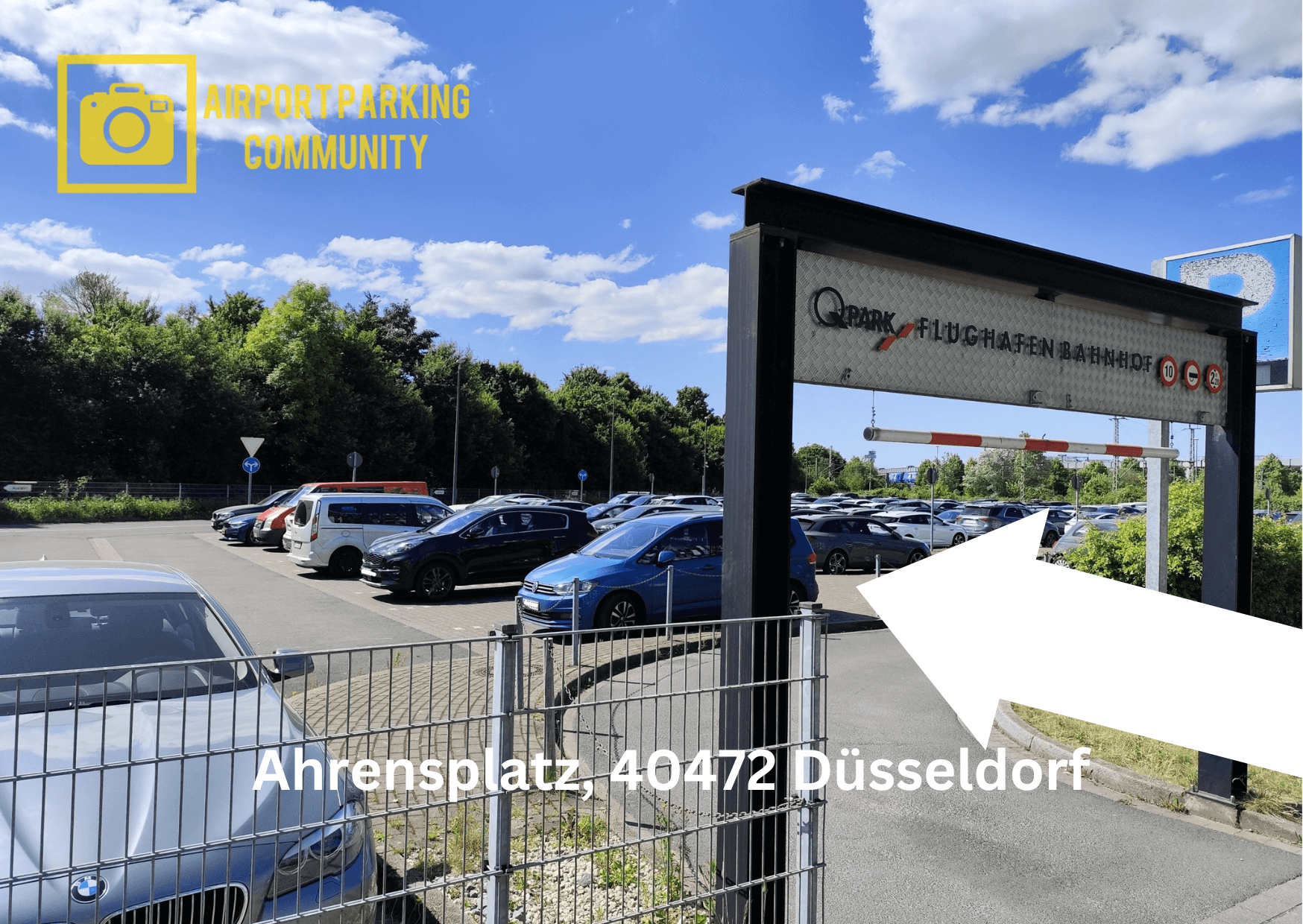 Parkplatz ist nur teilweise umzäunt. Parkplatzbuchtenmarkierungen sind deutlich zu erkennen. Die Entfernung zum Fernbahnhof am Flughafen DUS (S, RB, RE, IC, ICE) beträgt weniger als 80 Meter.